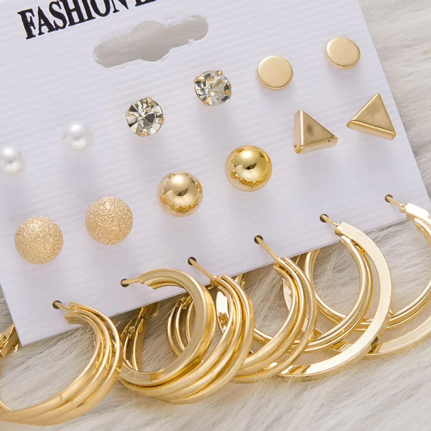 - Designs Included: Hoop earrings, geometric stud tops (triangles, circles, spheres), textured gold studs