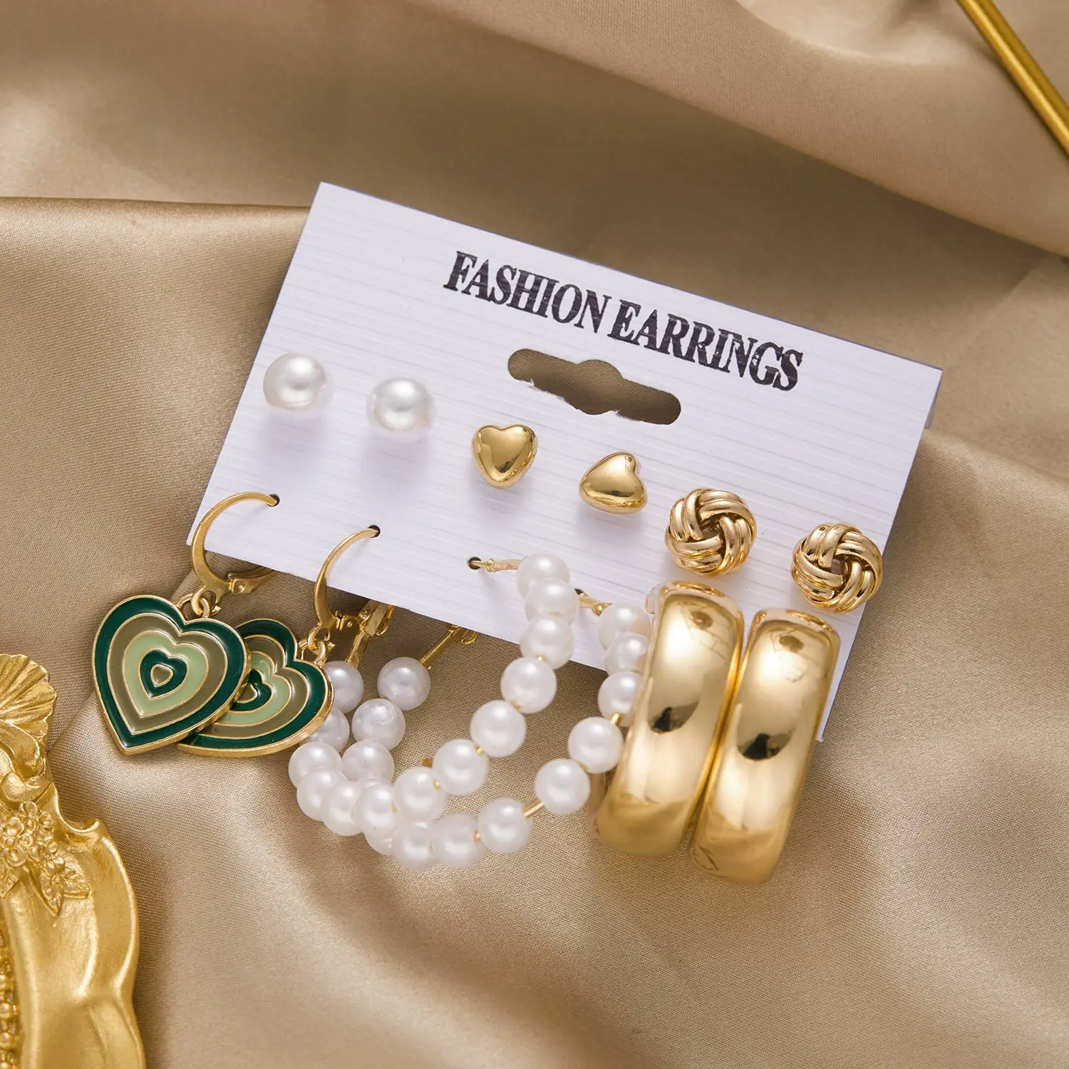 - Designs Included: Gold-tone hoops, pearl hoops, green and gold heart dangles, gold heart studs, knot studs, pearl studs